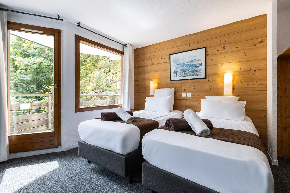 Chambre récemment rénovée avec un décor alpin munie de deux lits simples, des WC et salle de bain moderne, avec bain ou douche. De plus, la chambre dispose d’un balcon privé avec une magnifique vue sur les montagnes ou sur les pistes de ski. Chaque chambre a sa propre théière.