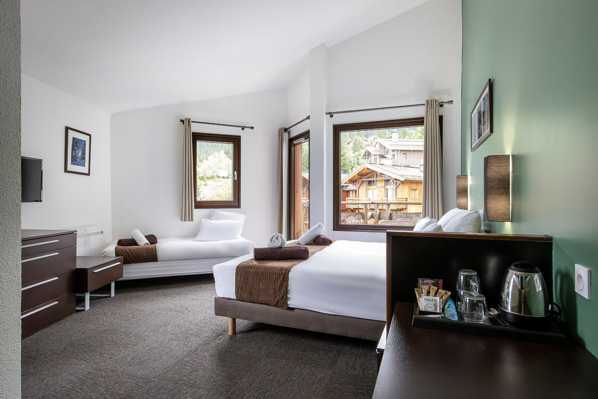 Chambre récemment rénovée, spacieuse, avec un décor alpin munie d’un lit double et lits superposés. WC et salle de bain moderne et séparés, avec bain ou douche. De plus, la chambre dispose d’un balcon privé avec une vue magnifique sur la vallée des montagnes ou des pistes. Chaque chambre a sa propre théière.