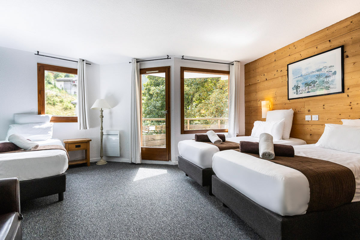 Chambre récemment rénovée, spacieuse, avec un décor alpin munie d’un lit double et un lit simple, ou trois lits simples. WC et salle de bain moderne et séparés, avec bain ou douche. De plus, la chambre dispose d’un balcon privé avec une vue magnifique sur la vallée des montagnes ou des pistes.